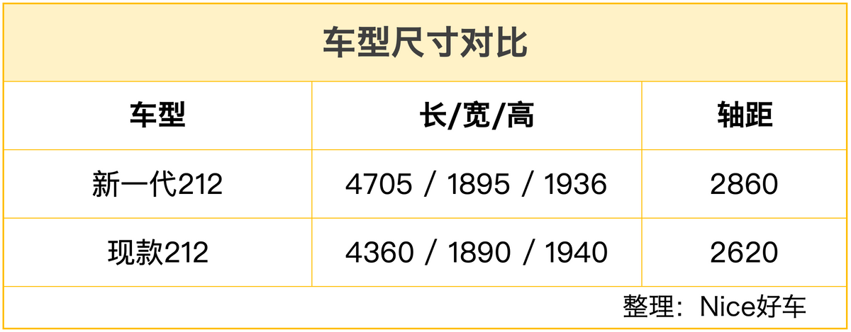 新車的尺寸以及軸距都較現(xiàn)款車型有所增加,其中長度足足漲了345mm,而軸距也有240mm的增長,不過高度就相對持平。另外,車身也增加了一些裝飾,包括前翼子板的212徽標(biāo)等。