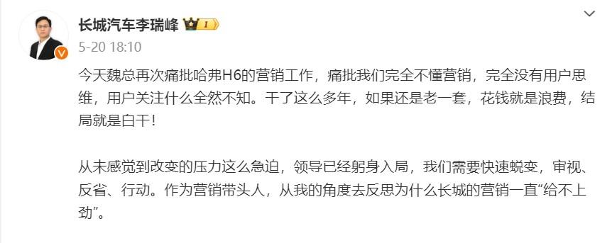 比如其實(shí)早在去年,長(zhǎng)城汽車(chē)就有一批高管集體入駐微博,但不久之后就沒(méi)有了聲音。前不久,魏建軍在親自上陣直播后,更是痛批哈弗H6的營(yíng)銷(xiāo)工作,直指團(tuán)隊(duì)“完全不懂營(yíng)銷(xiāo)”,完全沒(méi)有用戶思維,用戶關(guān)注什么全然不知。