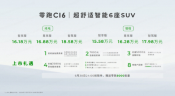 零跑C16上市指導(dǎo)價(jià)15.58-18.58萬(wàn)元。其中,C16純電車(chē)型520智享版指導(dǎo)價(jià)16.18萬(wàn)元、520尊享版指導(dǎo)價(jià)16.88萬(wàn)元、520智駕版指導(dǎo)價(jià)18.58萬(wàn)元; C16增程車(chē)型200智享版指導(dǎo)價(jià)15.58萬(wàn)元、200尊享版16.28萬(wàn)元、200智駕版17.98萬(wàn)元;在上市政策有效期內(nèi)繳納5000元定金,享整車(chē)、三電雙終身質(zhì)保,及價(jià)值至高2萬(wàn)元的上市禮遇。