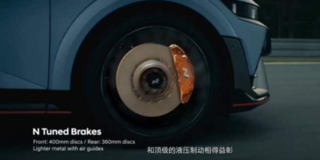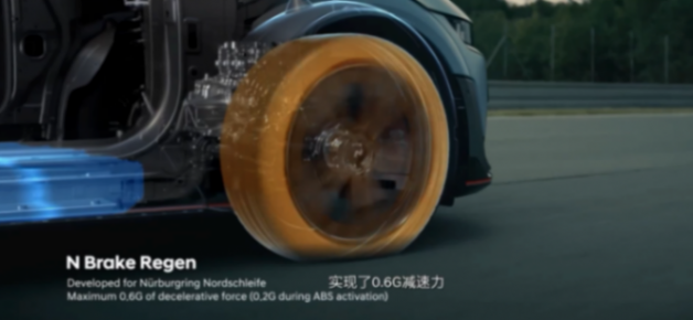 其次是剎車散熱,比如跑賽道時速200公里,急剎車,瞬間會產生高溫。IONIQ 5 N剎車帶有專用的氣流管道,防止高溫過熱。 同時針對后軸的動能回收也重新做了設計,采用了高功率的動能回收,可以提供0.6G的制動力。