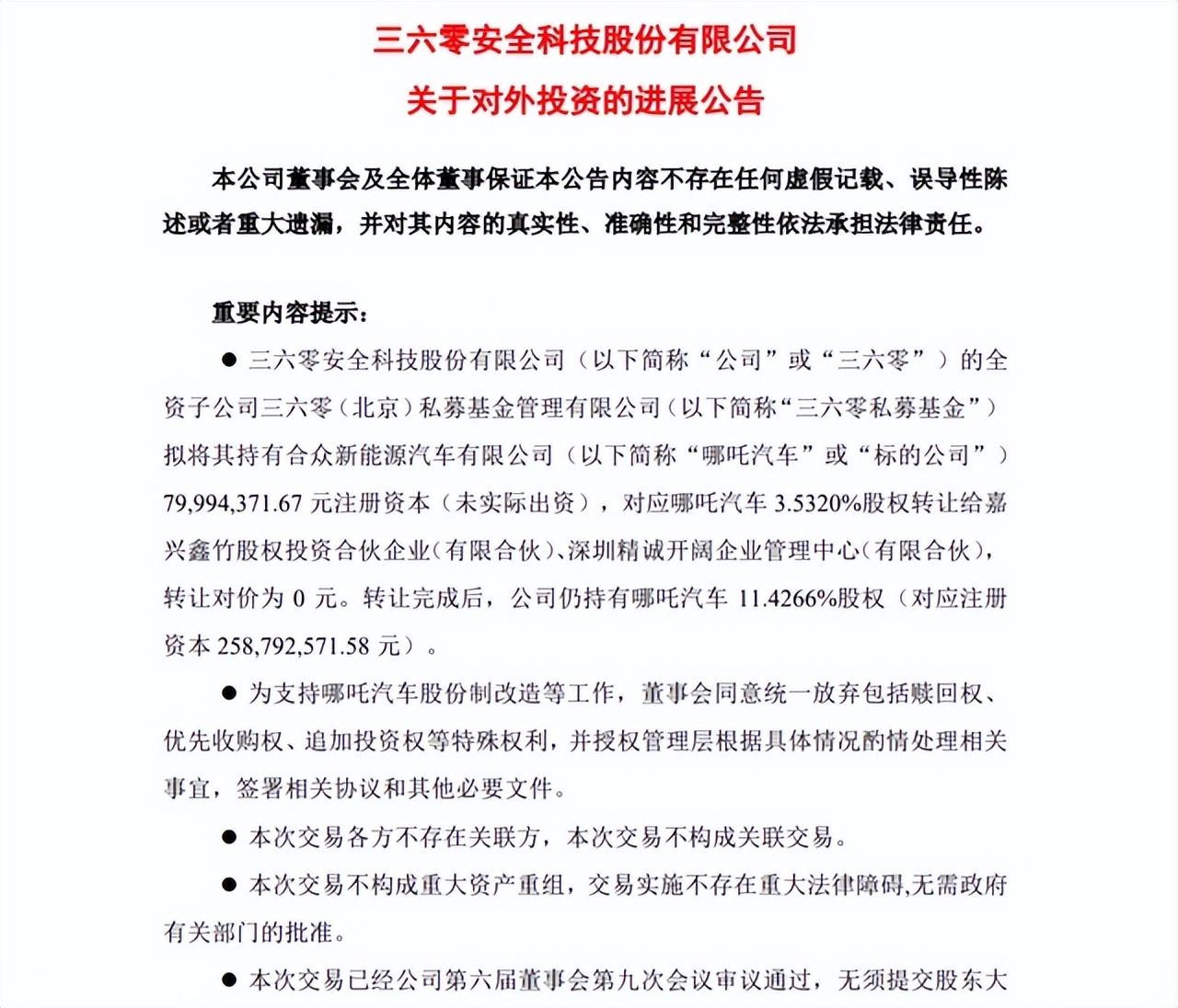2022年6月,360發(fā)布公告稱(chēng)將哪吒汽車(chē)3.532%股權(quán)轉(zhuǎn)讓給嘉興鑫竹股權(quán)投資合伙企業(yè)(有限合伙)、深圳精誠(chéng)開(kāi)闊企業(yè)管理中心(有限合伙)。盡管周鴻祎強(qiáng)調(diào)此舉并不是因?yàn)?ldquo;差錢(qián)”,而是想讓哪吒汽車(chē)有更多自主權(quán),但業(yè)內(nèi)人士的一致看法仍是“360對(duì)哪吒汽車(chē)信心減弱,希望趨利避害”。