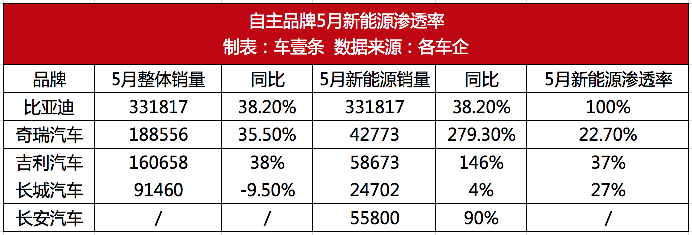 為此,《車壹條》根據比亞迪、奇瑞、吉利、長城、長安五家主流傳統企業最新發布的5月銷量數據進行了整理與排序。不難看出,處于引領地位仍然是比亞迪,其他企業則有不同程度的增長,他們與比亞迪一道正著力促成中國新能源市場一超多強的競爭格局。