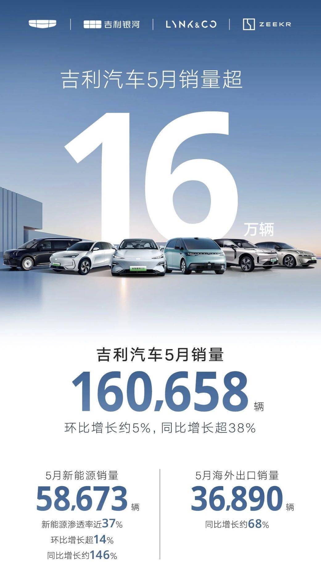 吉利在5月整體表現中其實與奇瑞相當,總銷量為160658輛,也有超38%的同比增幅。只不過與奇瑞的區別在于,奇瑞這次海外銷量是大頭,新能源銷量欠佳,而吉利雖然海外出口僅有3.7萬輛左右,但包括吉利、領克、極氪在內的新能源銷量卻同比增長了146%達到5.9萬臺左右,此外,吉利的新能源滲透率也高于奇瑞,接近37%。
