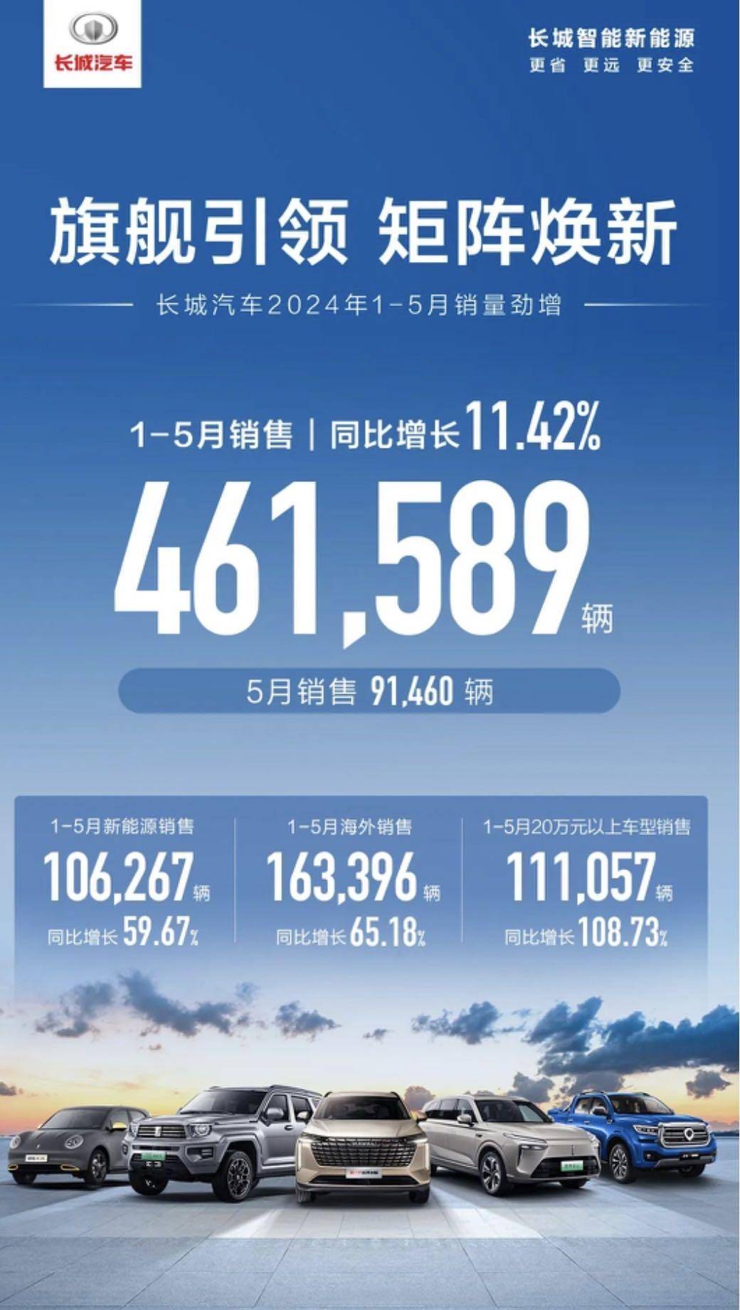 相較于比亞迪、奇瑞和吉利而言,長城汽車和這三家企業之間已經劃出了一條明顯的涇渭分界線。在5月份的銷量快報中,長城汽車著重公布了1-5月的合計銷量,5月份91460輛的這份數據被縮小了數倍的字號放在了累計數據的下方,此外,長城汽車5月的新能源銷量也未單獨公布。