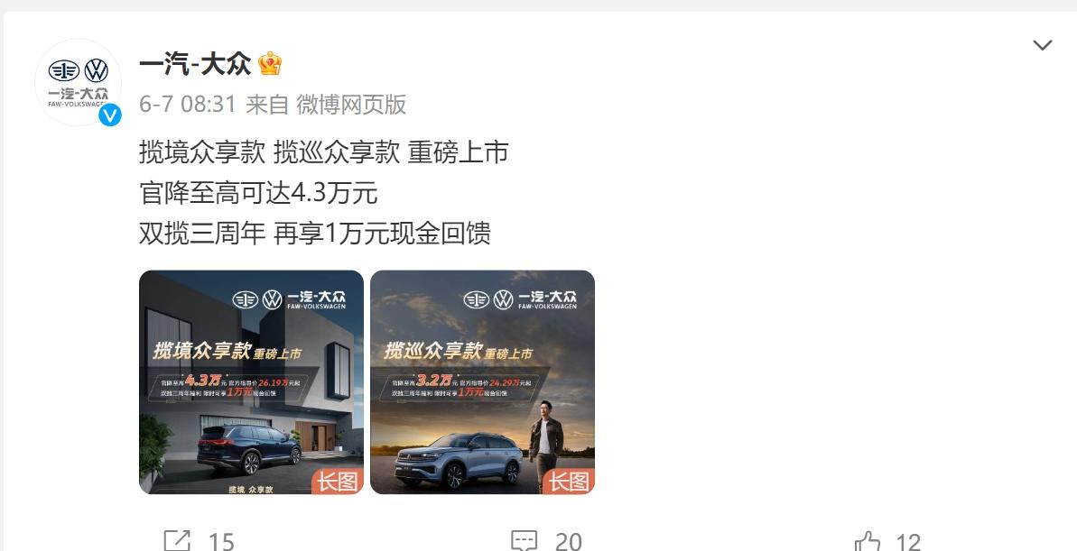 此外,在年中時(shí)刻,一汽-大眾也推出優(yōu)惠促銷,鬼哥在官方微博上看到,一汽-大眾的攬境眾享款和攬巡眾享款上市,官降至高達(dá)到4.3萬元,與此同時(shí),一汽-大眾還推出各種用戶權(quán)益,以及限時(shí)現(xiàn)金回饋,優(yōu)惠力度很大。