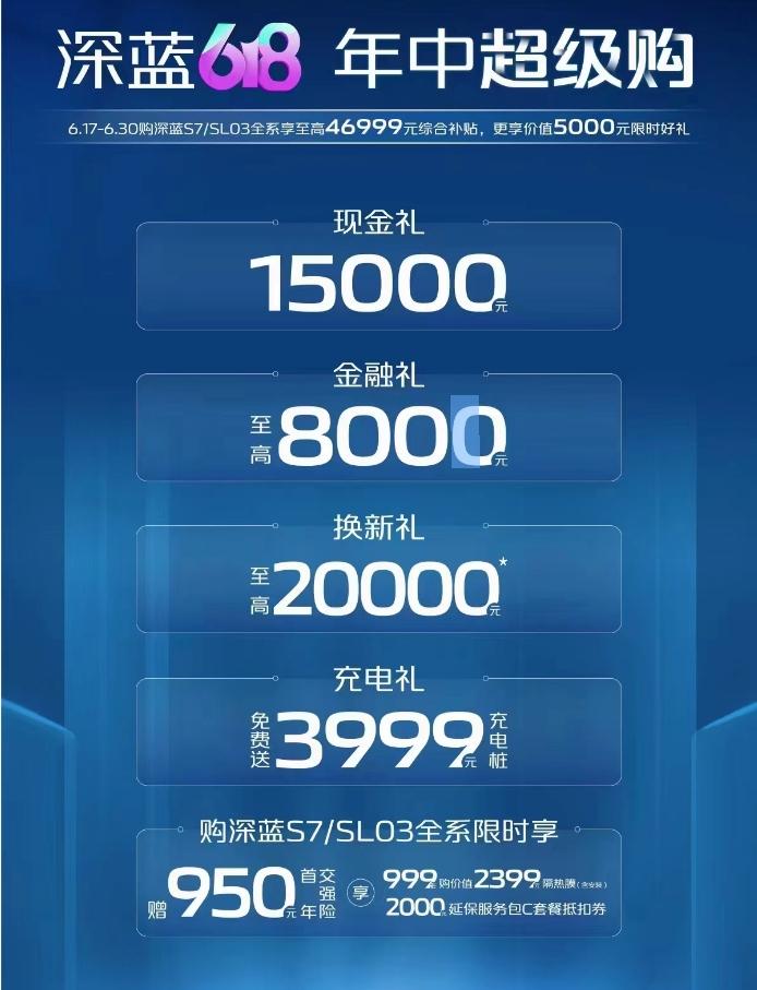 當(dāng)然,國產(chǎn)品牌也是來勢洶洶。深藍(lán)推出“618年中超級(jí)購”,活動(dòng)時(shí)間是6月17日-6月30日,這次參與活動(dòng)車型包括深藍(lán)S7/深藍(lán)SL03,全系至高優(yōu)惠達(dá)到46999元綜合補(bǔ)貼,還有價(jià)值5000元的限時(shí)好禮。現(xiàn)在,新能源市場內(nèi)卷升級(jí),深藍(lán)汽車一邊加推新車,一面推出優(yōu)惠促銷。