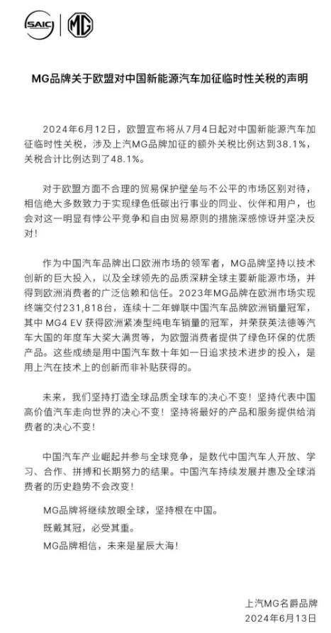歐盟一意孤行,繼續(xù)發(fā)布加征關(guān)稅的政策,也讓中國(guó)車(chē)企非常失望。上汽MG、吉利汽車(chē)紛紛在6月13日發(fā)布聲明。