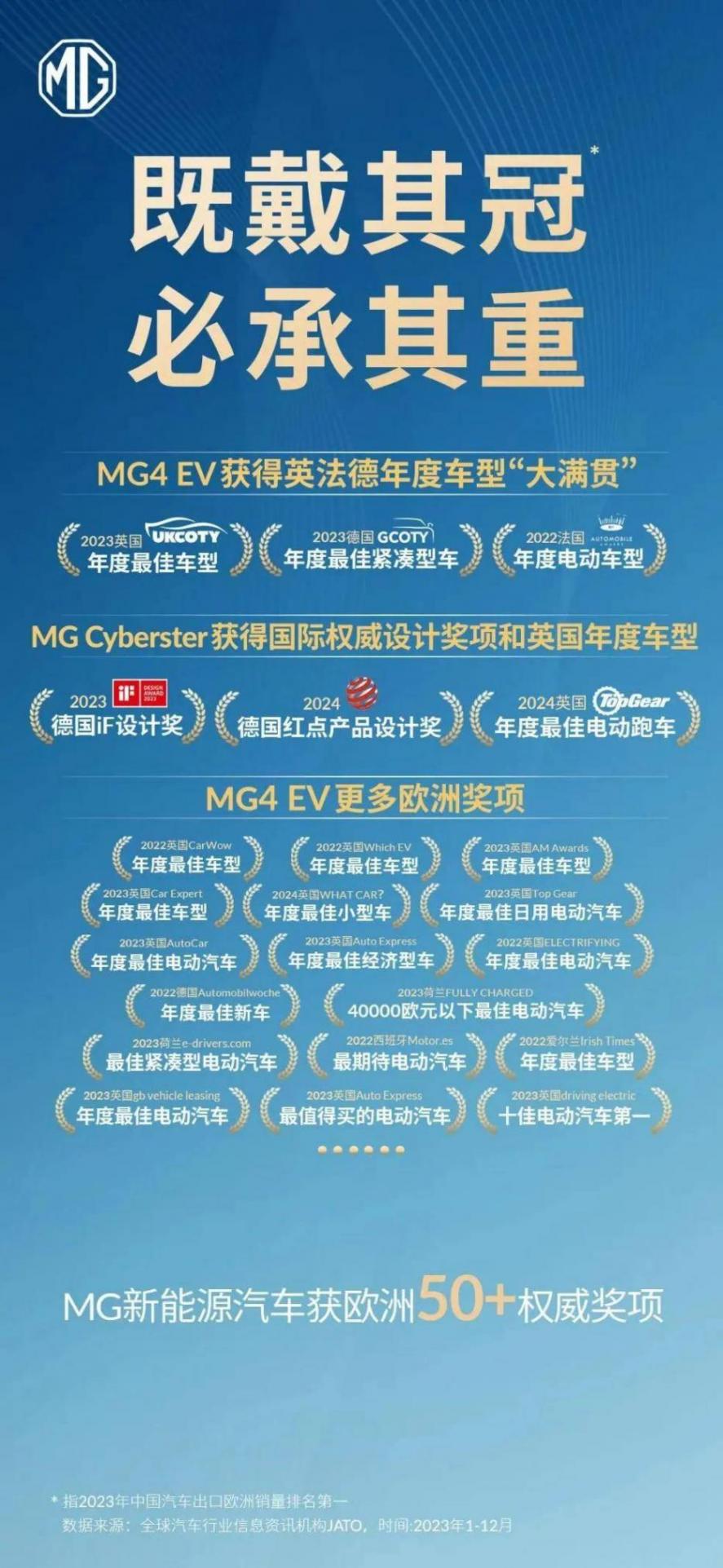 其中,MG品牌的“全球車(chē)”M4 EV不僅銷(xiāo)量領(lǐng)先,還拿獎(jiǎng)拿到手軟,2023年,該車(chē)型是首款斬獲英法德年度車(chē)大獎(jiǎng)大滿(mǎn)貫的中國(guó)車(chē)型,獲得“歐洲緊湊型純電車(chē)銷(xiāo)量冠軍”與“中國(guó)新能源車(chē)型出口冠軍”。