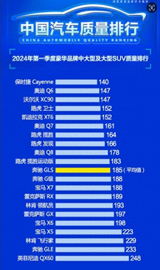 另外,奧迪Q8排名第九位,質量測評分數達到178分,路虎攬勝運動版排名第十位,質量測評分數達到183分;奔馳GLS排名第十一位,質量測評分數達到185分,這些老牌豪華品牌旗下SUV的品質確實很靠譜。