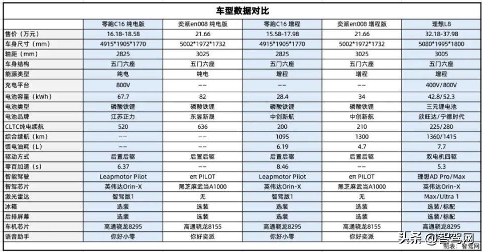 從核心數據上對比,零跑C16在車身尺寸、軸距上略遜于eπ008和理想L8,增程版車型,電池容量低于理想L8,但在性價比下,零跑C16是對半式砍價。