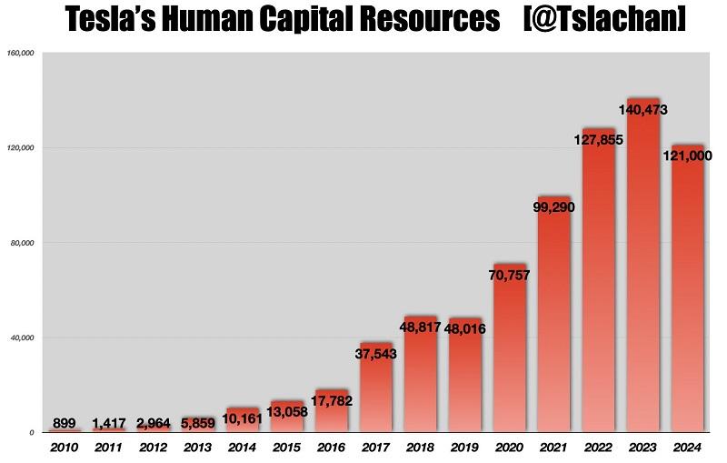 不過,據(jù)CNBC最新發(fā)布的一份報告顯然,特斯拉目前擁有約121,000名工人,包括受薪工人和小時工。而截至 2023 年底,特斯拉共有140,473 名員工,這表明特斯拉的一輪裁員最終影響了該公司約14%的員工。