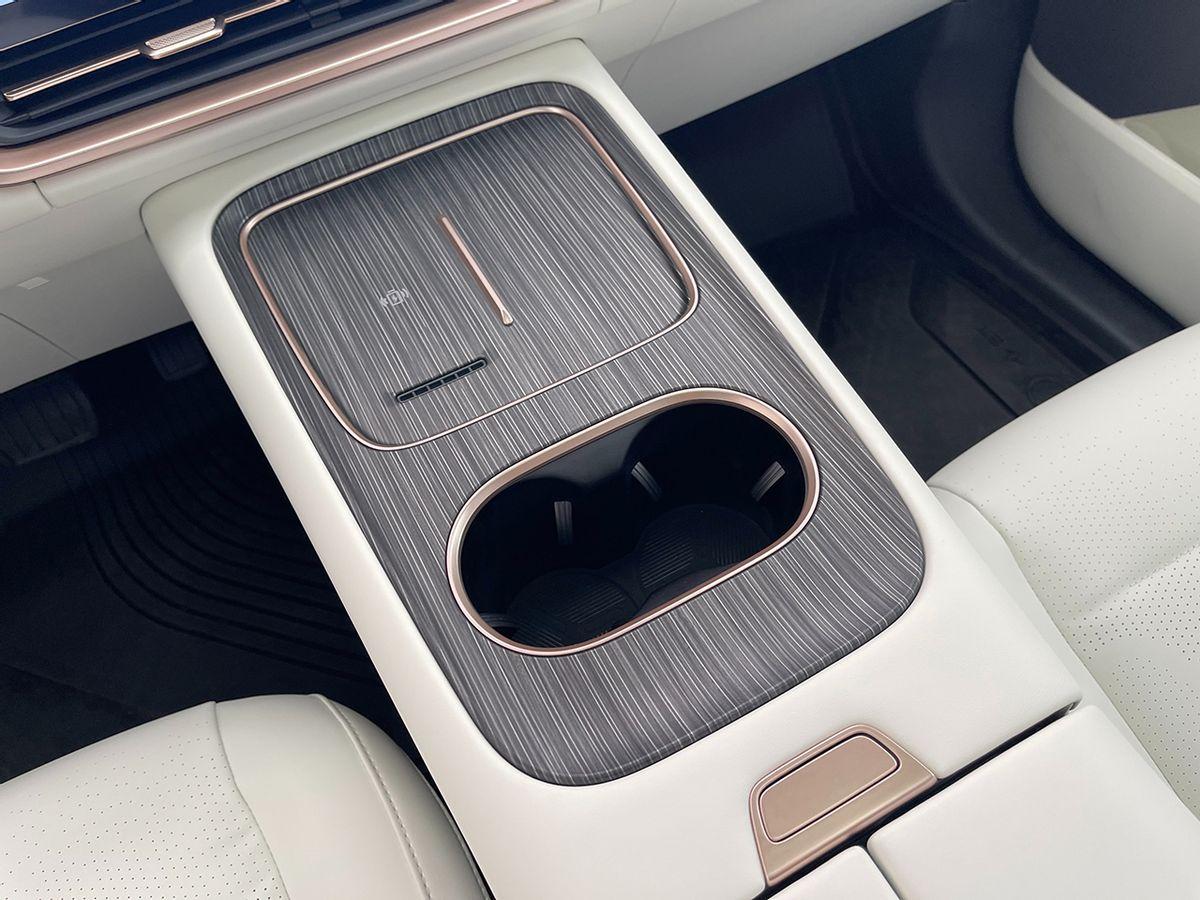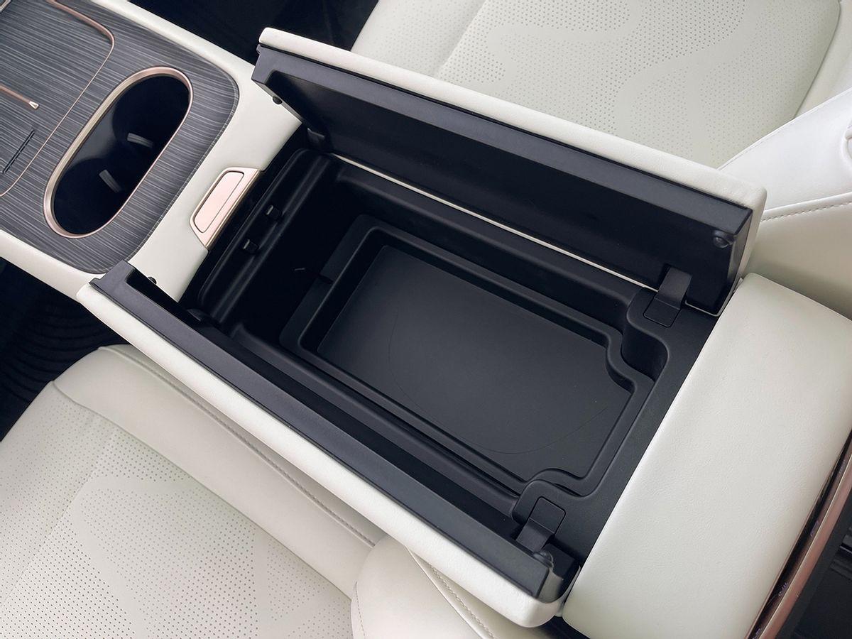 中央扶手這塊還是挺精致的,能看到一塊深色的木紋飾板,手機(jī)放置區(qū)域的左邊部分支持無線充電,功率達(dá)到50瓦,并支持主動(dòng)散熱。