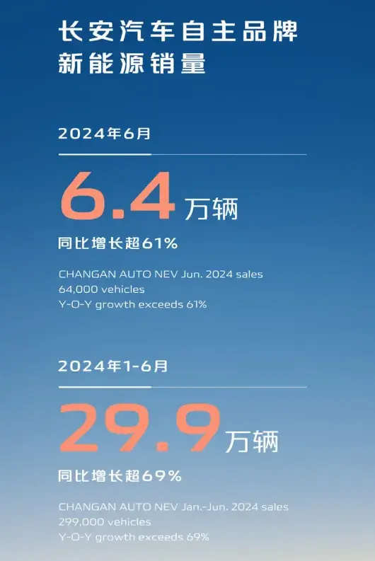 長安汽車自主品牌新能源車的市場銷量也迎來高速增長,6月份長安汽車自主品牌新能源銷量6.4萬輛,同比增長超61%。2024年1-6月長安汽車自主品牌新能源銷量29.9萬輛,同比增長超69%。具體來看,長安啟源1-6月交付72968輛;深藍汽車1-6月交付83858輛;阿維塔1-6月交付29030輛。