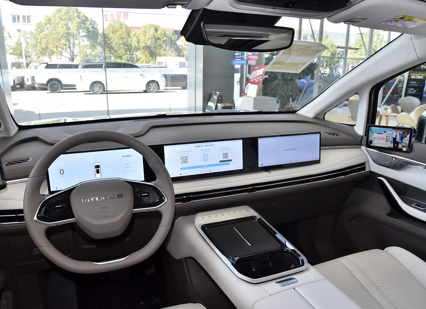 進入車內,新車平直的錯層式中控臺部分有著三聯大屏的設計,結合兩側門板上方的電子后視頻屏幕,五塊屏幕提升了車內的科技感,并且中控臺突出的平臺以及貫穿式的空調出風口設計,讓新車的層次感以及視覺寬度都表現出色,雙幅式的多功能方向盤集成了車內所有的物理按鍵,中控臺部分只有著無線充電面板設計,讓車內的設計更加精致。