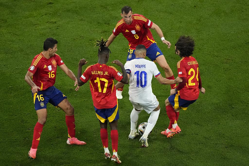 然而,西班牙人非常堅定,他們持續用前場的高位逼搶和傳接,局部分割對手,讓對手艱于呼吸。這是他們擅長的一套,法國隊也有自己擅長的一套——“茍字訣”,只是這一回零星的細節走向沒有垂青法國人,如果亞馬爾的射門偏一點,如果薩利巴的解圍遠一點,或許西班牙隊還需要陷入苦戰。