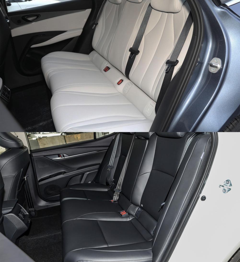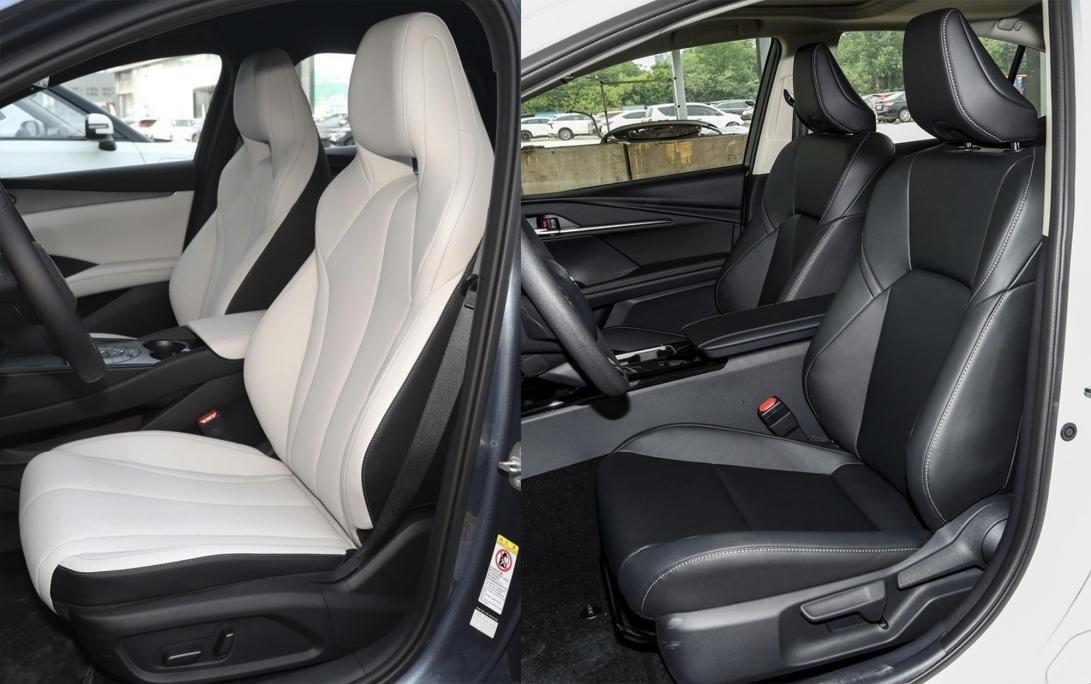 海豹06 DM-i提供一體式運動座椅,坐墊與靠背填充物采用加厚處理,形變量很大,與身體貼合度很高,而且有良好的承托性和腰部支撐。主駕提供8向電動調節(高低4向),副駕為4向電動調節、前排座椅支持加熱與通風,駕駛位帶記憶功能。凱美瑞的座椅也是仿皮材質,填充物軟硬適中,坐墊與靠背都有良好的側向支撐,前傾的頭枕也能提供合適的頸部支撐。座椅采用6向手動調節,配置上有些簡陋。