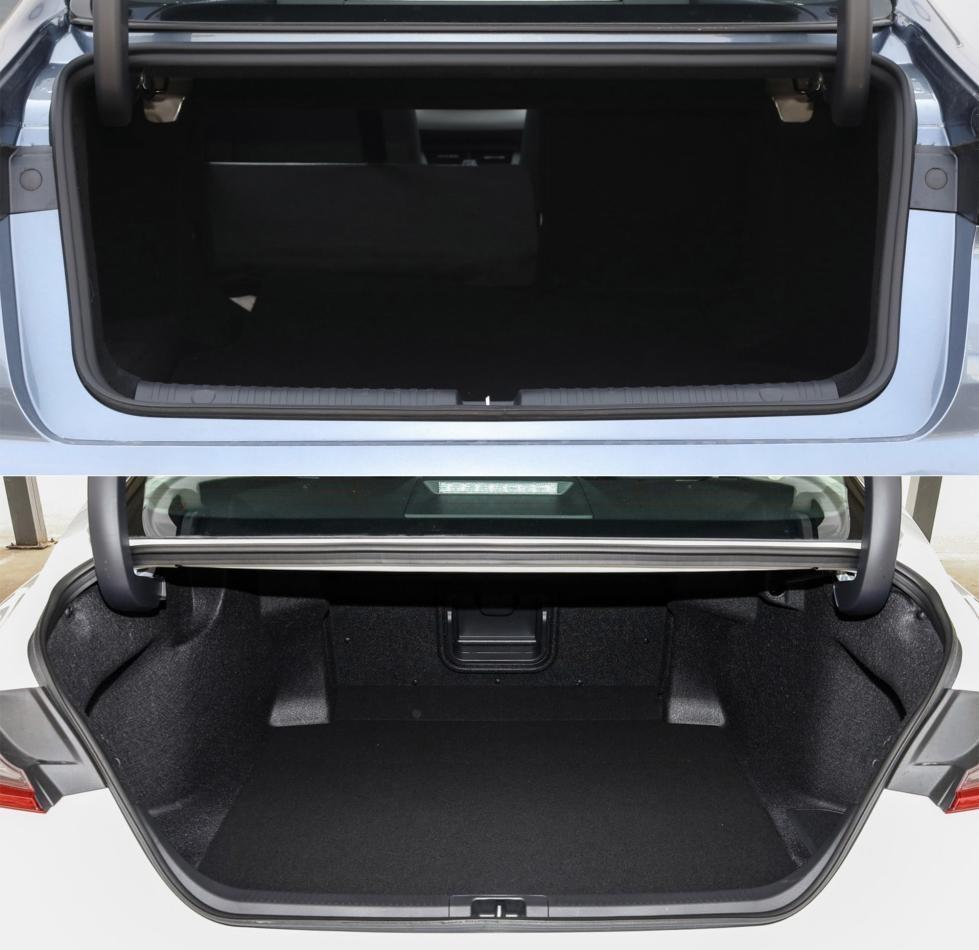 海豹06 DM-i的尾箱常規容積達到550L,縱深與寬度都很出色,長途旅行夠用。后排座椅支持4:6分割放倒,平整度也不錯,空間拓展性良好。凱美瑞的尾廂空間也比較大,容積沒有公布,后排也不支持放倒。