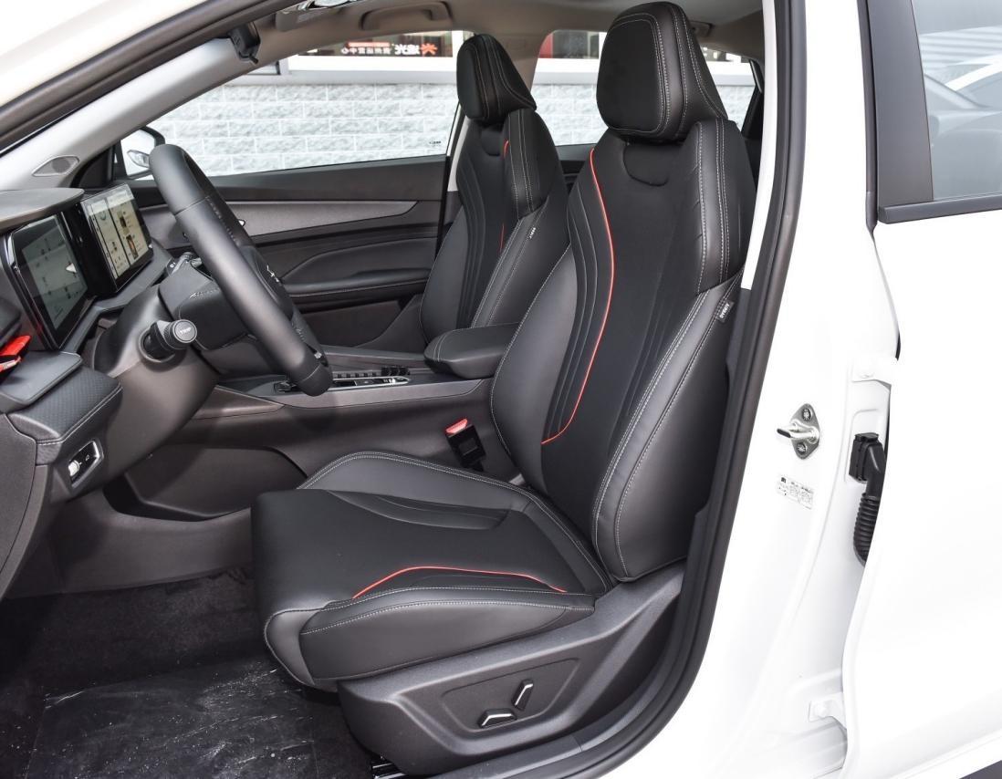 一體式運動座椅是仿皮材質,增加橙色線條強化運動感。填充物軟硬適中,坐墊長度充足,靠背有不錯的側向支撐。主駕位提供6向電動調節,舒適性有保證。