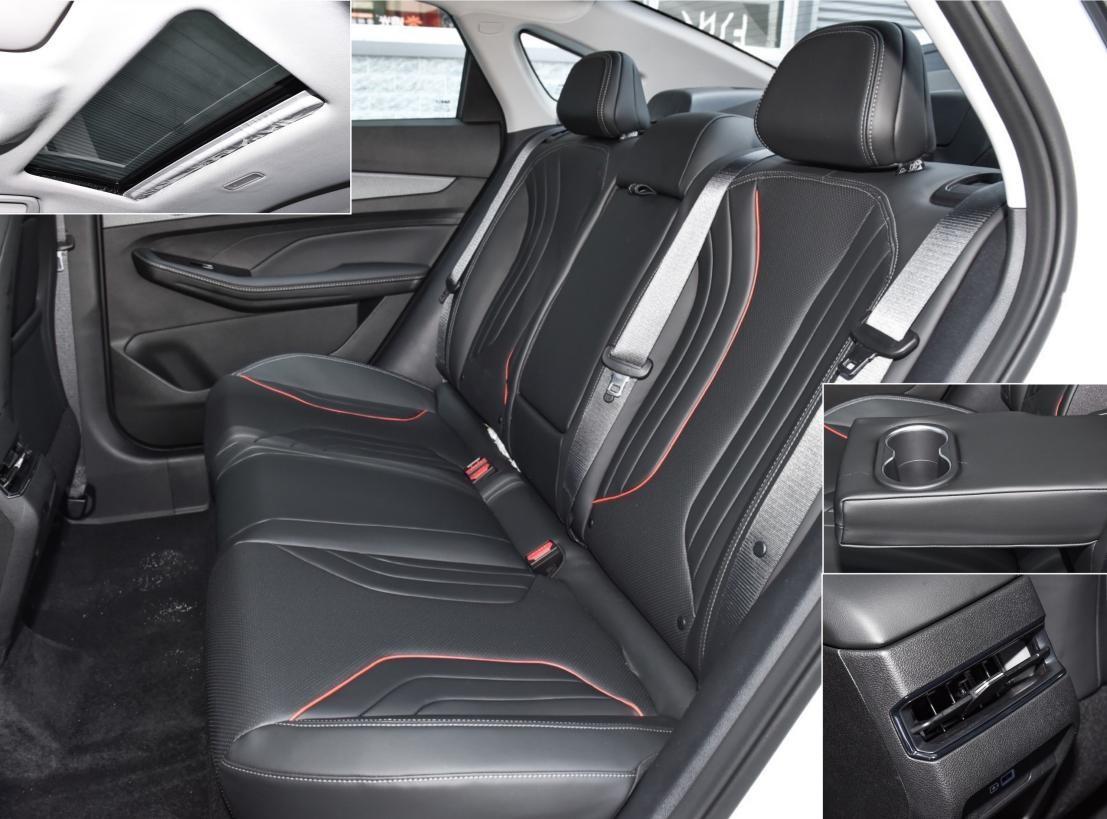 后排座椅材質相同,也有橙色裝飾,靠背有合適的傾斜度和一定的側向支撐,坐墊長度夠用。空間方面,侃弟身高175cm,腿部空間一拳半,頭頂三指略多,橫向基本可乘坐三人,地板平整度較高。配置方面,有天窗、后排出風口和帶雙杯架的可翻折扶手。