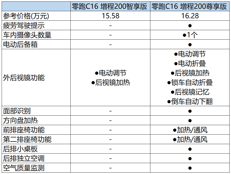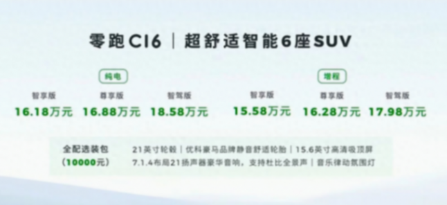 當(dāng)然,不同的車型版本,配置也會有差異。那么零跑C16的6款配置該如何來選呢?