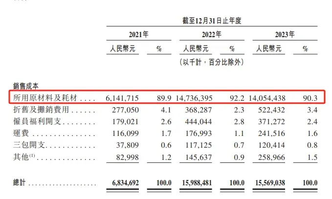 哪吒汽車的所用原材料及耗材成本2021年、2022年、2023年為61.41億元、147.36億元、140.54億元。作為比較,2021年、2022年、2023年?duì)I收為50.86億元、130.49億元,135.54億元。