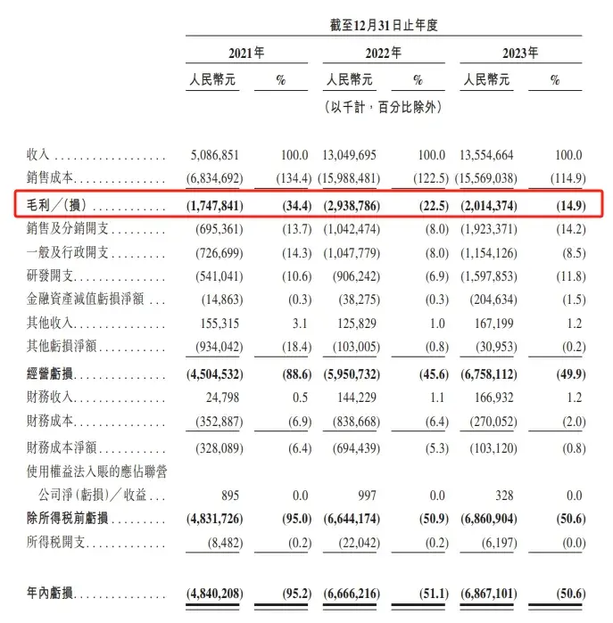 而哪吒汽車的毛利率卻是負(fù)數(shù)。過去幾年雖有提升,但2023年仍為-14.9%。這意味著哪吒汽車在賠本賣車,每售出一輛車,車連成本都收不回來,越賣越虧。
