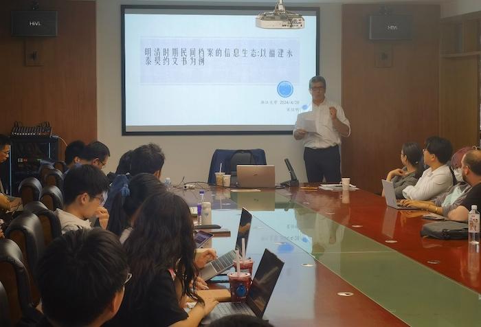 2024年4月28日下午3點,宋怡明教授在浙江大學歷史學院開展講座,其演講題目為“民間檔案的信息生態——以永泰契約文書為例”。浙江大學歷史學院杜正貞教授主持講座。