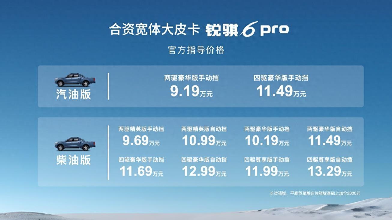 9月20日,鄭州日產銳騏6 Pro正式上市,售價9.19-13.29萬元。新車提供汽油/柴油、手動/自動、兩驅/四驅、標箱/長箱/平箱等35種款型選擇。其中,汽油版車型售價區間為9.19-11.49萬元,柴油版車型售價區間為9.69-13.29萬元。