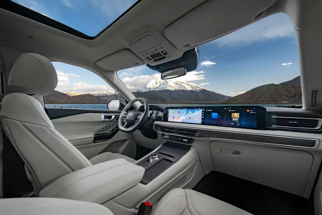 內飾方面,全新福特探險者配備了全液晶儀表盤和27英寸的中控大橫屏的組合。屏幕內部升級了SYNC+3.0智行信息娛樂系統,并結合了百度AI技術提升語音識別效率。