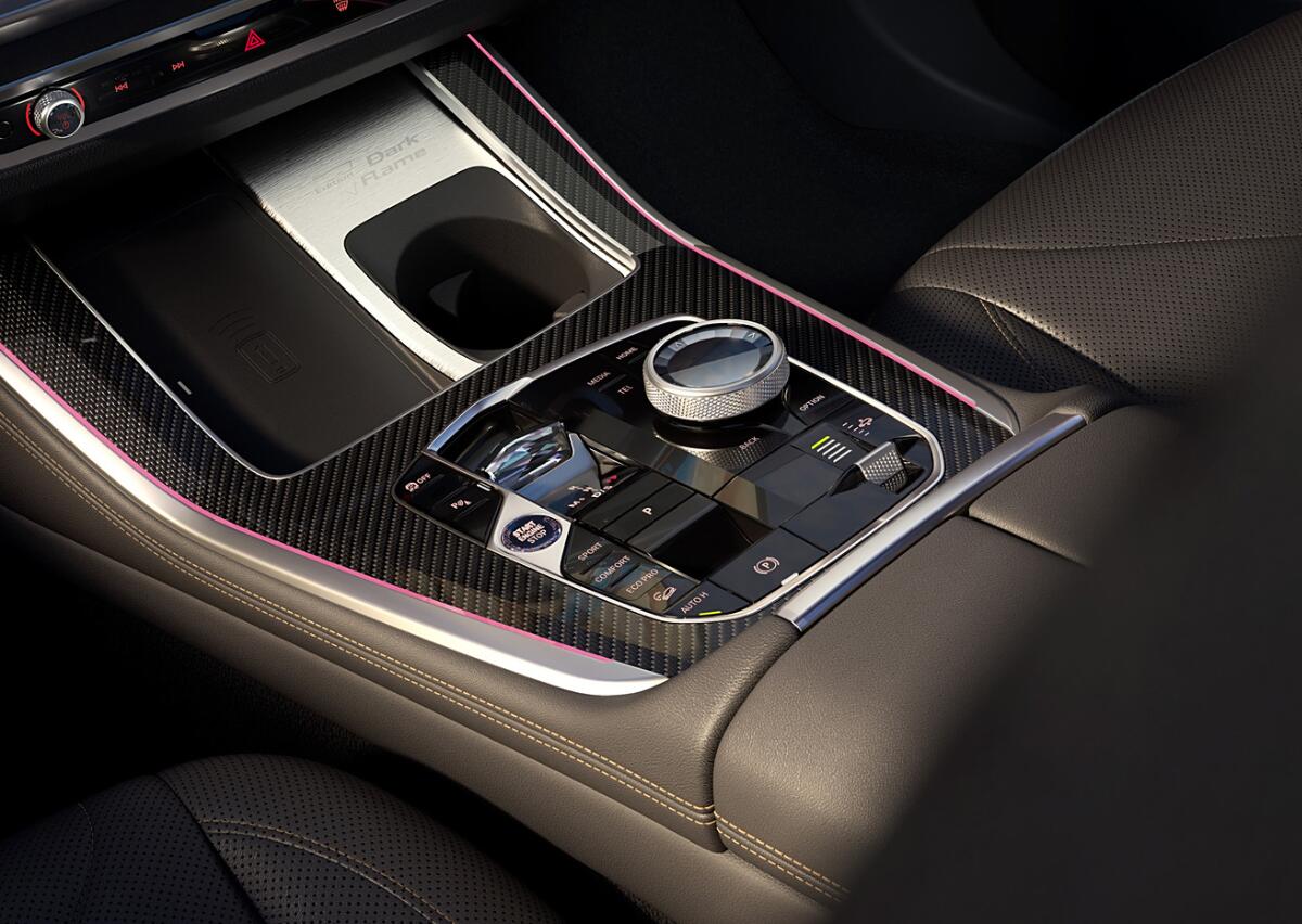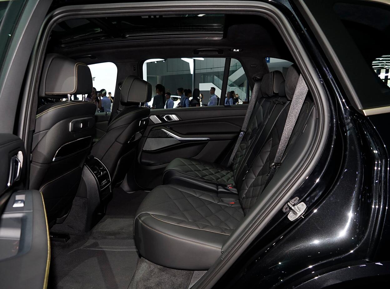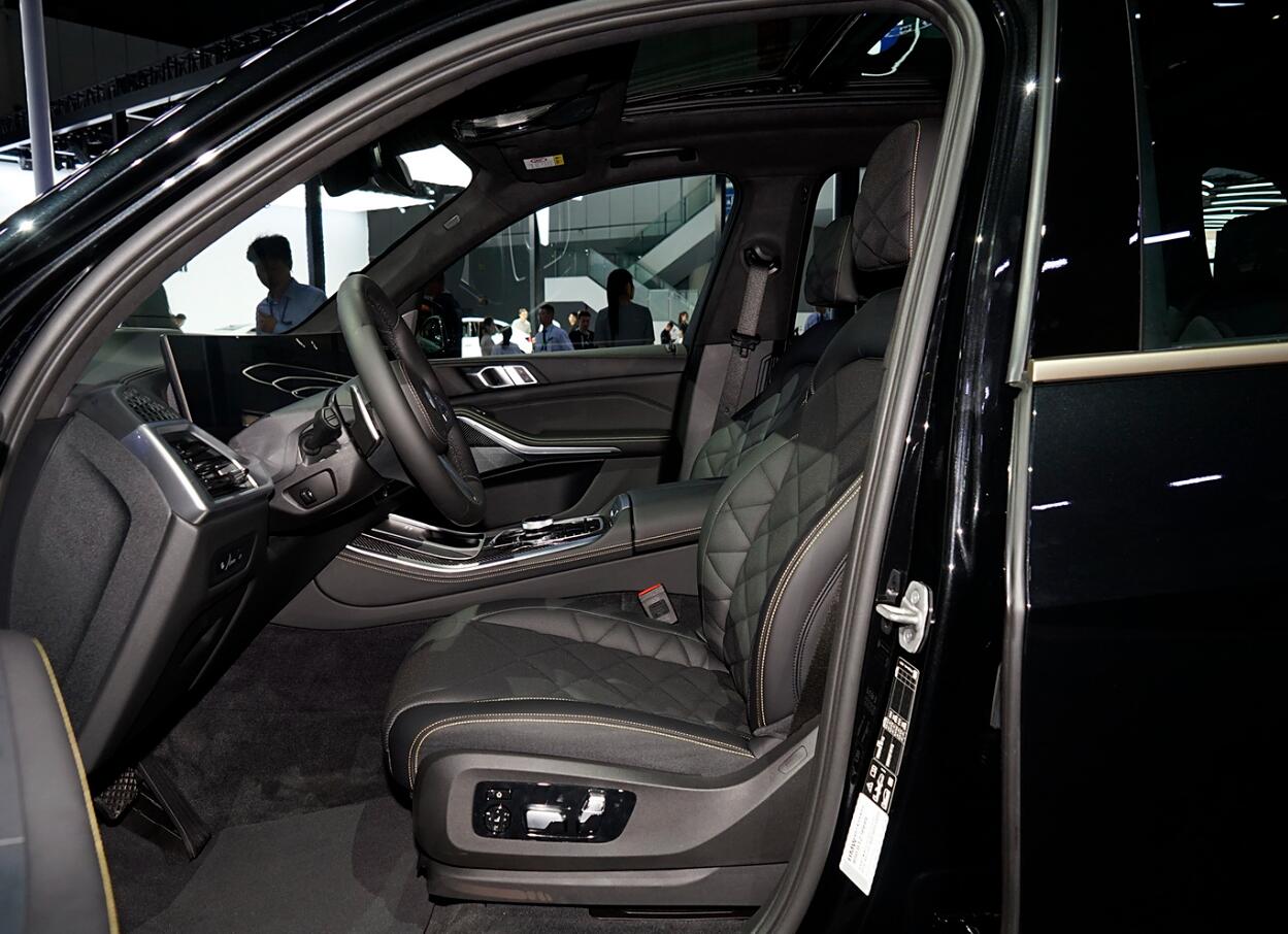 外觀方面,全車覆蓋了炭黑的金屬漆,前臉的中網、前大燈、雙腎進氣格柵邊框、前包圍進氣口、車側通風口等細節處融入了泰坦金色元素。側面,車窗外側部分也有著金色飾條進行包圍,22英寸純黑色輪轂和黑色M運動卡鉗進一步增強了運動氣息。尾部,雙對立的錐形LED尾燈帶有強烈的未來感,后包圍經過熏黑處理,并配備金色標識。同時,迎賓踏板處帶有專屬“Dark Flame”標識,并配有“Dark Flame”迎賓燈。