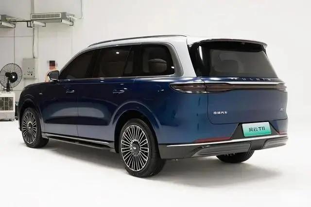 來到車身側面,車身給人奔馳邁巴赫GLS車型的既視感,值得一提的是,問界M9也采用了雙色車身。老實說此次風云T11的側身造型,確實提升了不少檔次。尤其是255/45R21的密輻輪轂,及車窗部分的銀色雙拼,更符合國產大型 SUV的定位。從尺寸上來看,風云T11車身長度為5150/1995/1800 mm,軸距3100 mm,車身很大,完全符合大型 SUV的標準尺寸。