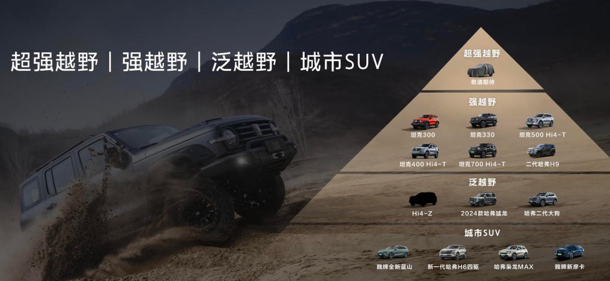 其中,哈弗H6、魏牌藍山、摩卡等車型為城市SUV;Hi4-Z、哈弗猛龍、哈弗二代大狗為泛越野;搭載Hi4-T的坦克系列車型與坦克300、哈弗H9等為強越野。