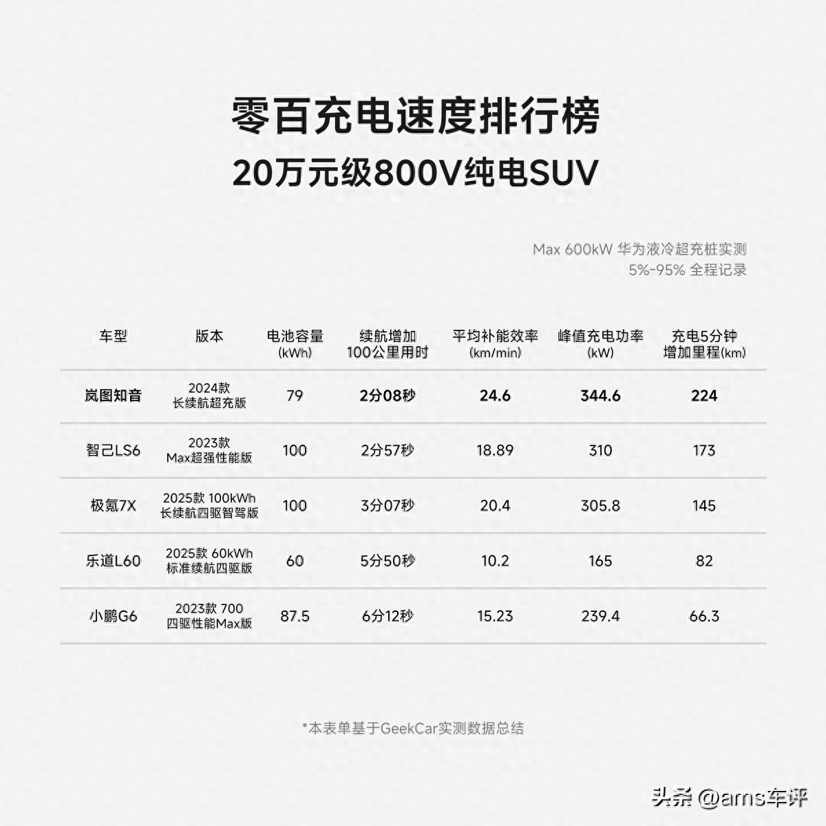 其中,嵐圖知音2024款長續航超充版在續航增加100公里用時、峰值充電功率、充電5分鐘增加里程、平均補能效率、SOC 20%-80%區間用時五項指標中,均排首位,充分展示了新能源大廠的硬核三電實力。