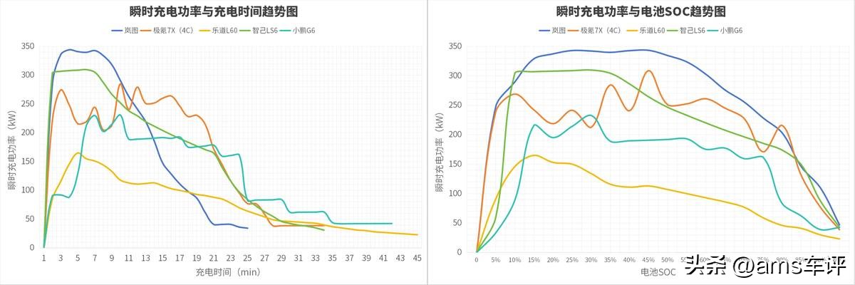 通過綜合功率和SOC相關數據,還能反映出更多細節。嵐圖知音的補能效率明顯高于其他四款車型,在SOC 5%的低電量狀態下實現高功率充電,充電2-3分鐘、SOC 21%左右時達到最高344.6kW的充電功率,且能維持近8分鐘保持充電功率在300kW以上。
