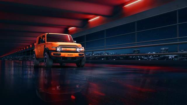 V23不僅在設(shè)計(jì)上致敬經(jīng)典,更融合當(dāng)下新能源設(shè)計(jì)的趨勢,打造出獨(dú)一無二的視覺體驗(yàn)。V23造型方正硬朗,車身尺寸長4220mm、寬1915mm、高1845mm,接近1:1的高寬比,配合21吋大輪轂,賦予整車超越同級的體量感和視覺沖擊力。圓形大燈、固定式側(cè)踏板、C柱盲窗等經(jīng)典越野元素,與現(xiàn)代科技外露式四角透明毫米波雷達(dá)罩、立體懸浮式“小書包”、樂高模塊剎車尾燈等設(shè)計(jì)相結(jié)合,使V23既“復(fù)古經(jīng)典”又“科技賽博”。