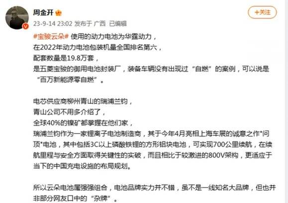 不過這樣的設計優勢似乎沒有得到網友的認可,反而被指是“雜牌”電池。于是時任上汽通用五菱品牌事業部副總經理周钘連夜發微博為電池供應商“站臺”,還稱其“是五菱寶駿的御用電池封裝廠”、“百萬新能源零自然”,寶駿也迫于輿論壓力,增加了三電終身質保政策。