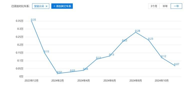 自去年底開始,云朵的銷量一路走跌,今年6月份以前,云朵月均銷量僅維持在千臺以下的水平,最低的是2月份的243臺。下半年,在報廢補貼、置換補貼等的帶動下,云朵銷量雖有回暖,最高的也不過是8月份的2830臺。而2024年前11個月,云朵累計銷量只有1.6萬臺。