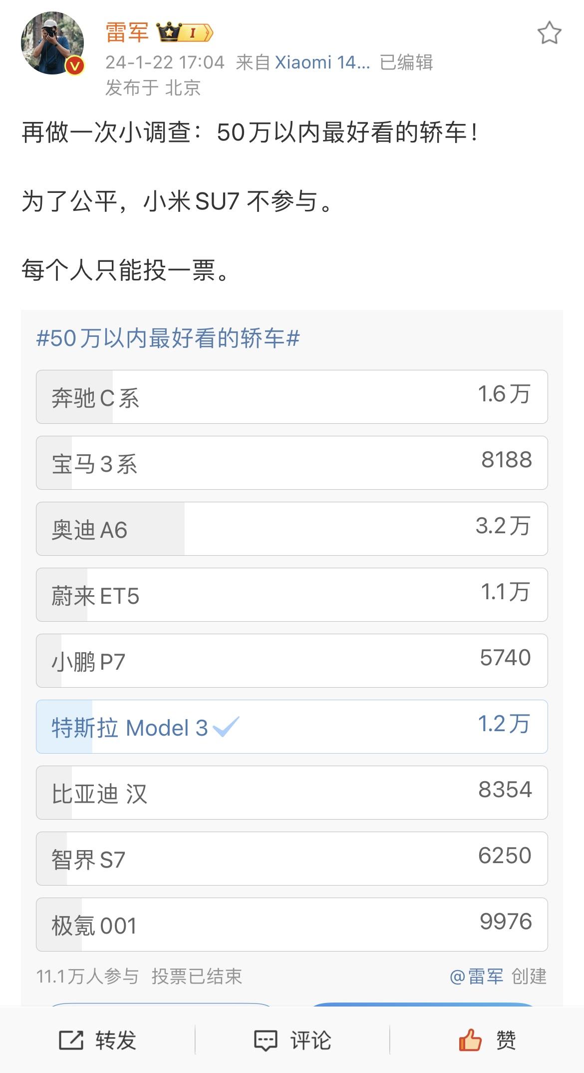不知道大家還記不記得,今年年初,小米SU7還沒有上市的時候,雷軍就在自己的社交媒體平臺上搞了一次“50萬以下轎車誰最好看”的投票,結果出乎很多人的意料,奧迪A6L以巨大的優勢遙遙領先,成為網友心中50萬元以下最好看的轎車產品,沒有之一,超越了Model 3等一眾轎車產品。
