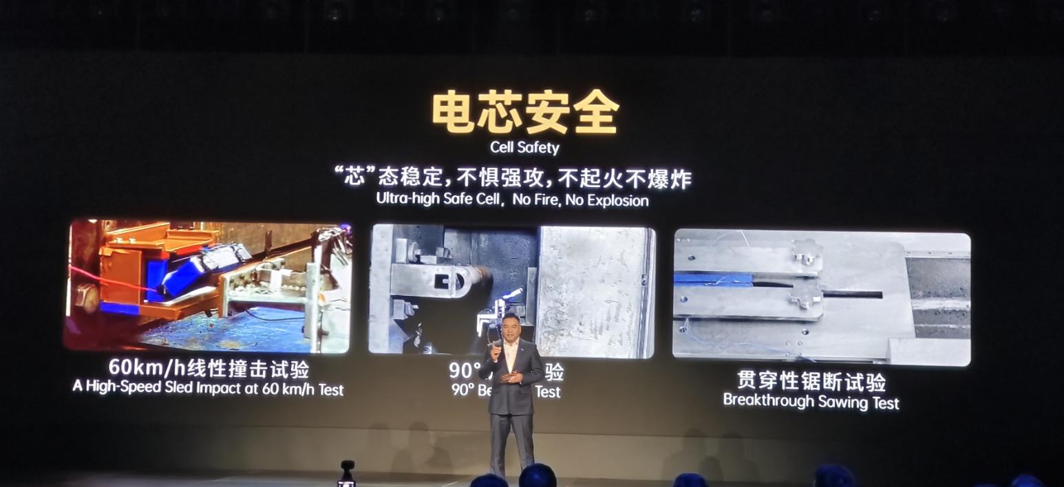 在電芯安全方面,磐石底盤整合了NP技術以及高延伸率的高韌吸能絕緣膜,以確保電芯的超高安全系數。值得注意的是,電芯本身經過了60公里時速滑車撞擊、90°折彎、暴力鋸斷破壞橫截面直接裸露等三大超嚴苛測試,測試結果表明電芯不起火、不爆炸。