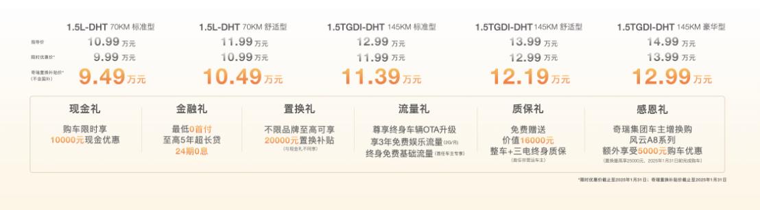 12月17日,奇瑞汽車旗下的風(fēng)云A8L正式上市,此次新車共推出了5種配置版本,包括:1.5L-DHT 70KM標(biāo)準(zhǔn)型10.99萬元、1.5L-DHT 70KM舒適型11.99萬元、1.5TGDI-DHT 145KM標(biāo)準(zhǔn)型12.99萬元、1.5TGDI-DHT145KM舒適型13.99萬元、1.5TGDI-DHT 145KM豪華型14.99萬元,并帶來購車至高享價值41000元的驚喜6重禮遇,并且算上奇瑞置換補貼價后,最低售價9.49萬元起(不含國補)。