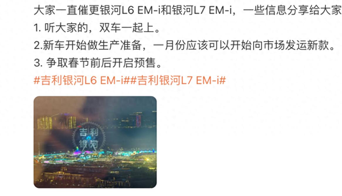 日前,我們從相關渠道獲悉,新款銀河L6/L7預計將于春節前后開啟預售!目前的話,新車已經開始做生產準備,一月份應該可以開始向市場發運新款。如果有感興趣的小伙伴,可以來了解一下。