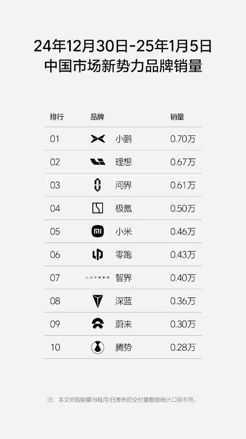 2025年第1周新勢(shì)力銷量,小鵬冠軍,理想二,問(wèn)界第三,騰勢(shì)墊底
