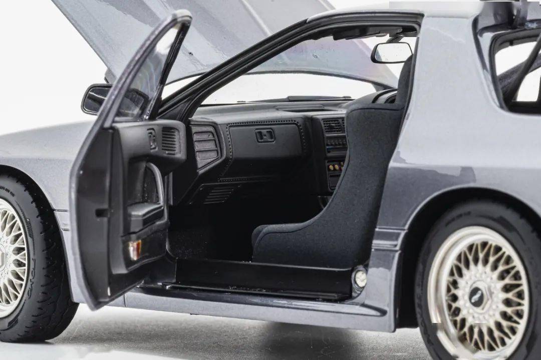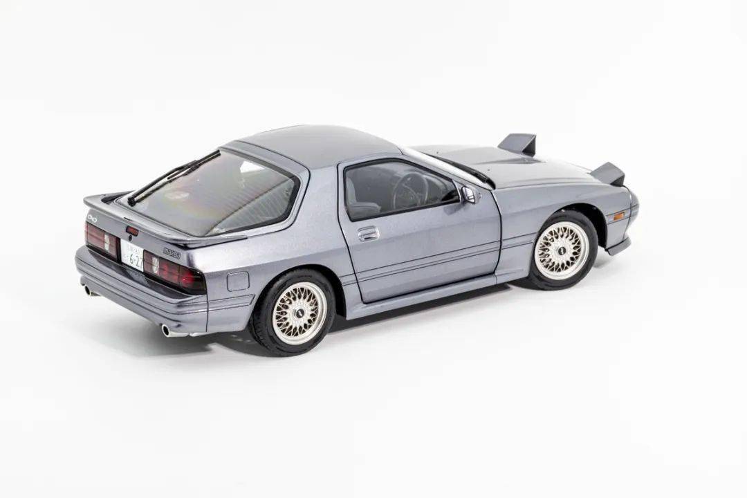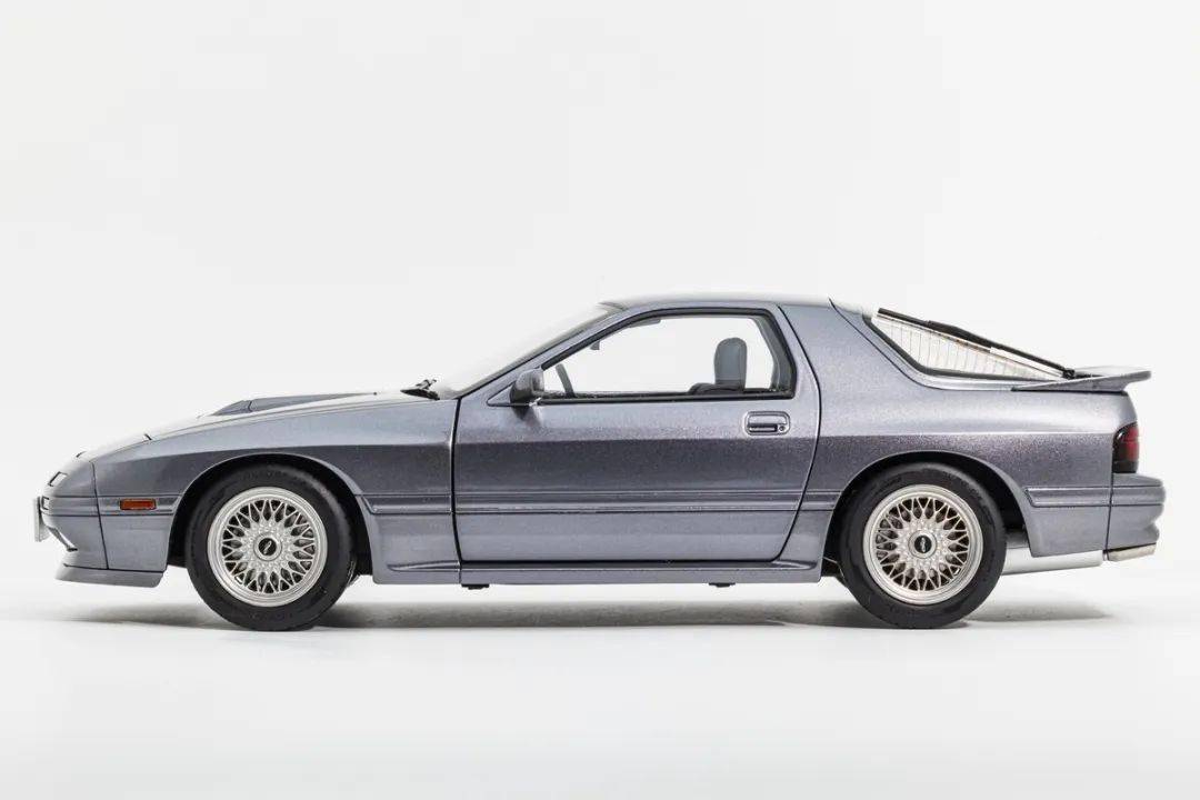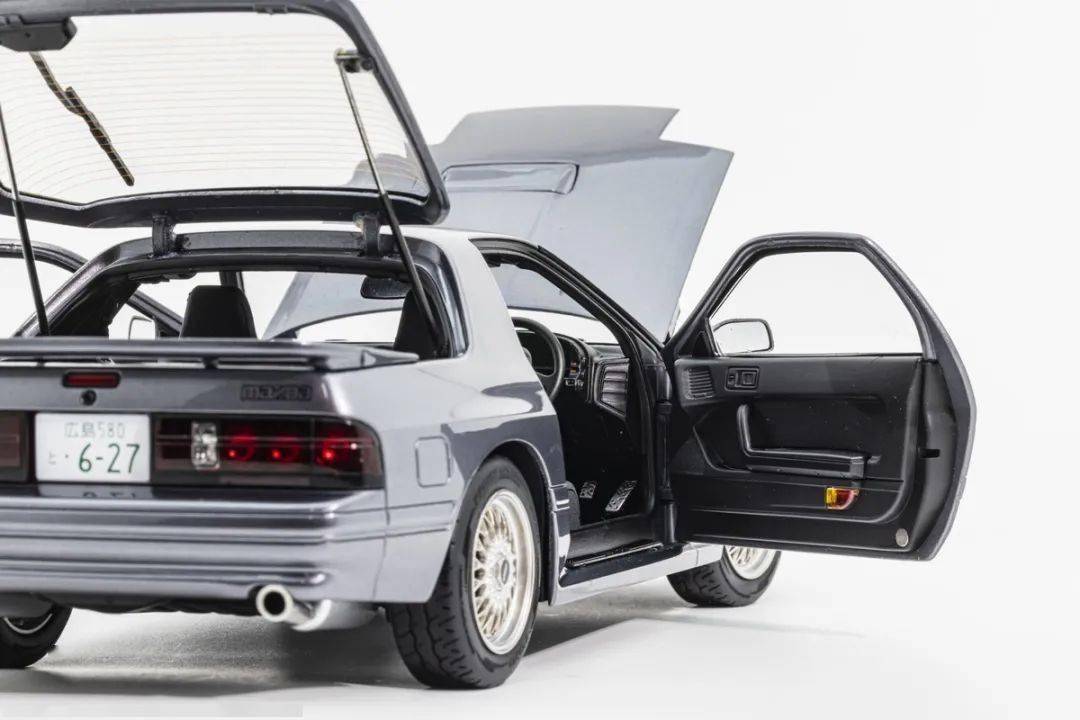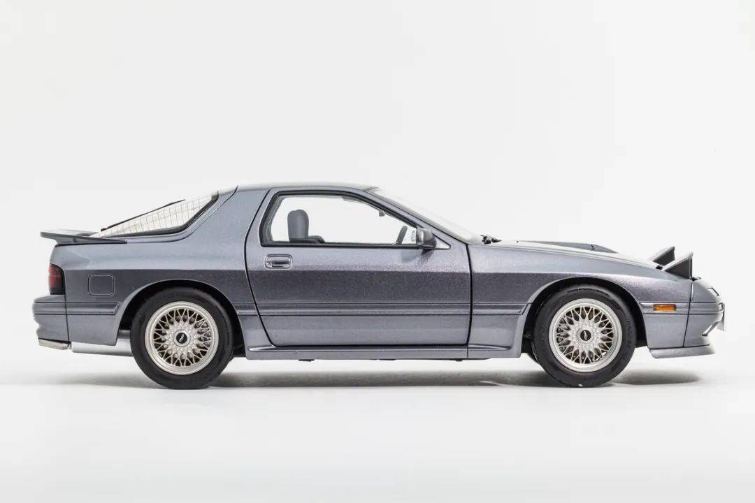 WHELART的這款馬自達(dá)RX-7 FC采用真車3D采樣的方式獲取數(shù)據(jù),形準(zhǔn)這點(diǎn)上我們是基本不用擔(dān)心的,這也是現(xiàn)在中高端合金全開模型的基操了;模型的整體比例均衡,縫隙控制得也很不錯;灰色的漆面略帶金屬顆粒,漆面均勻度也是非常不錯的;模型的車門把手、側(cè)轉(zhuǎn)向燈、車外后視鏡都是獨(dú)立分件的,車窗邊框浮雕刻畫,黑色分界很清晰;模型的尾翼也是獨(dú)立分件的,整體結(jié)構(gòu)上和早期AA的產(chǎn)品非常接近,但漆面和細(xì)膩程度上有所提升;車身側(cè)面還有那個(gè)年代最喜歡的側(cè)面飾條,這個(gè)在模型上應(yīng)該是獨(dú)立分件的,而且質(zhì)感很不錯。(注意真車型號略有不同,僅供參考)