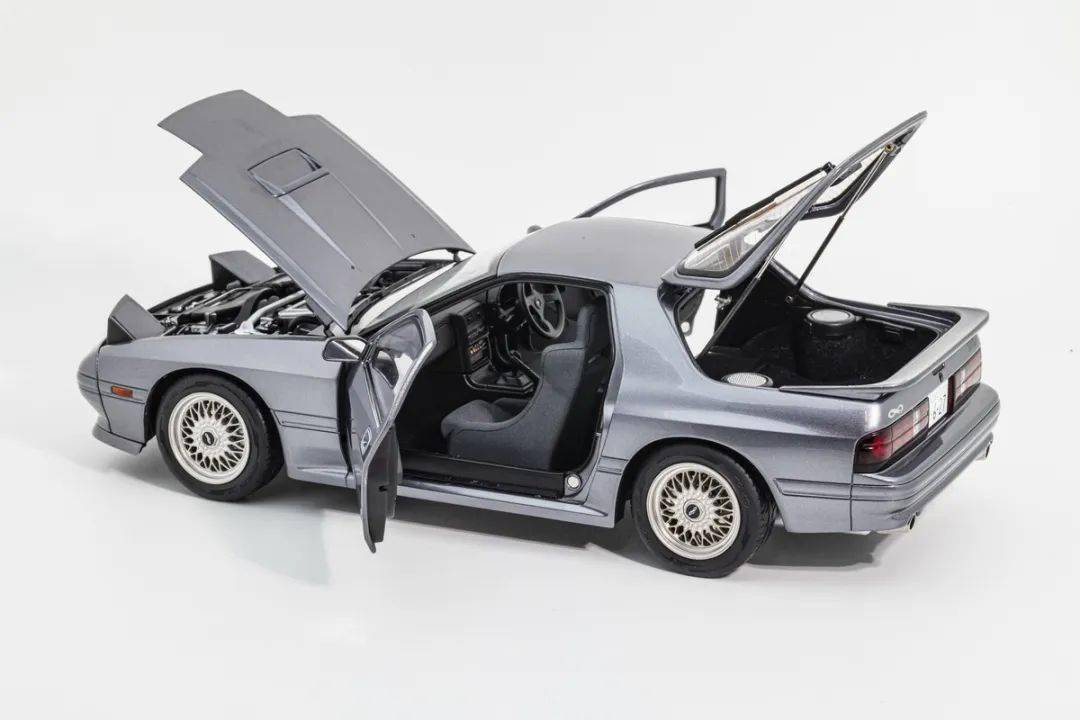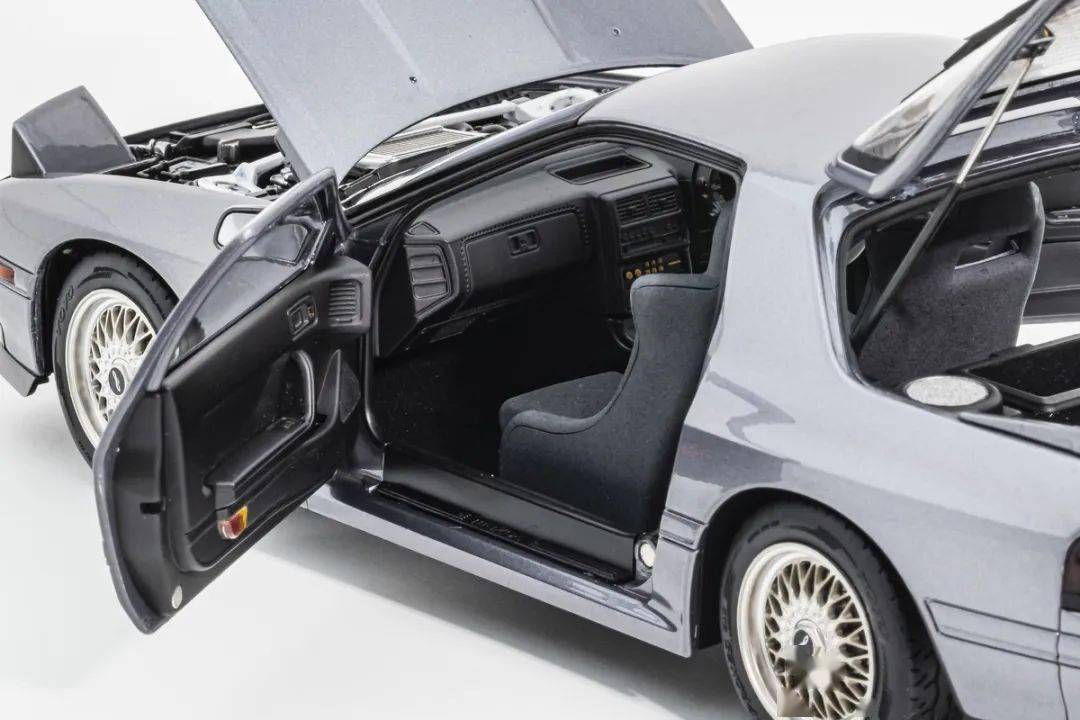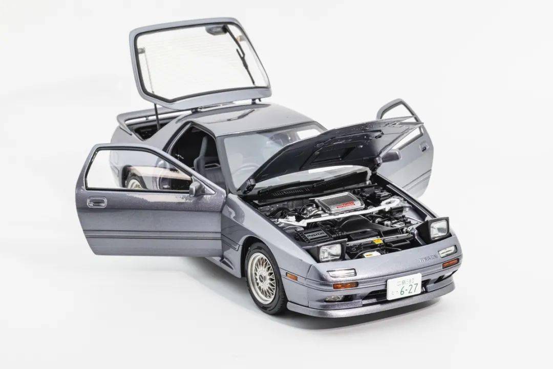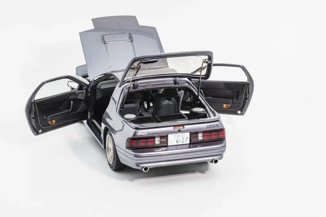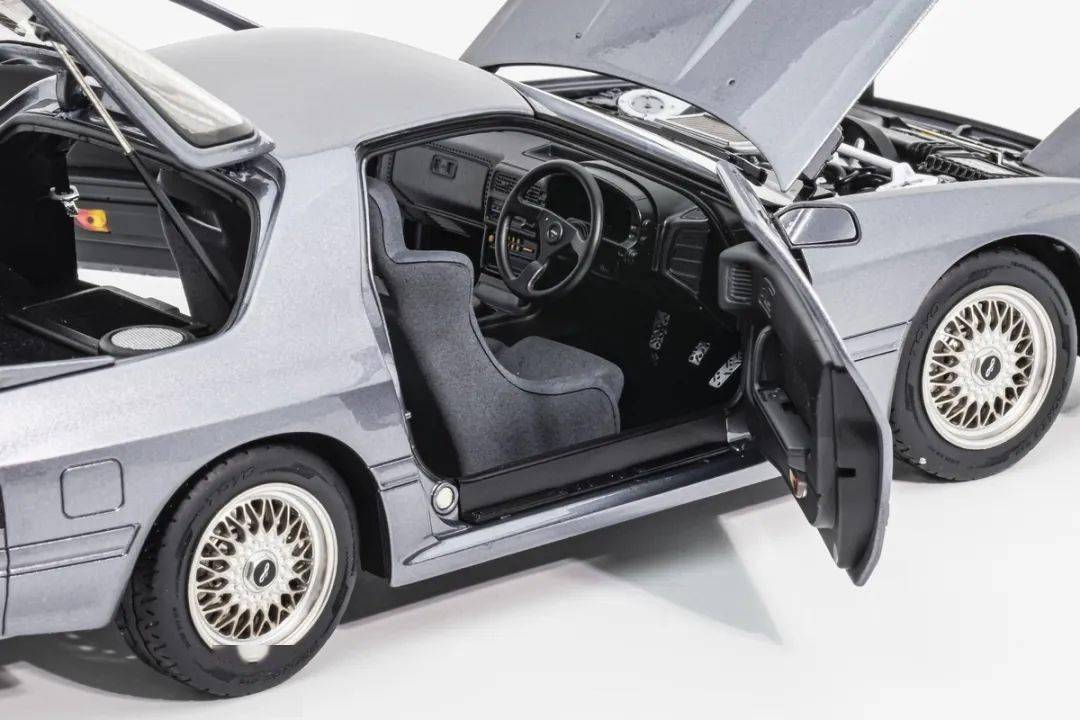 WHELART的這款馬自達(dá)RX-7 FC采用真車3D采樣的方式獲取數(shù)據(jù),形準(zhǔn)這點(diǎn)上我們是基本不用擔(dān)心的,這也是現(xiàn)在中高端合金全開模型的基操了;模型的整體比例均衡,縫隙控制得也很不錯;灰色的漆面略帶金屬顆粒,漆面均勻度也是非常不錯的;模型的車門把手、側(cè)轉(zhuǎn)向燈、車外后視鏡都是獨(dú)立分件的,車窗邊框浮雕刻畫,黑色分界很清晰;模型的尾翼也是獨(dú)立分件的,整體結(jié)構(gòu)上和早期AA的產(chǎn)品非常接近,但漆面和細(xì)膩程度上有所提升;車身側(cè)面還有那個(gè)年代最喜歡的側(cè)面飾條,這個(gè)在模型上應(yīng)該是獨(dú)立分件的,而且質(zhì)感很不錯。(注意真車型號略有不同,僅供參考)