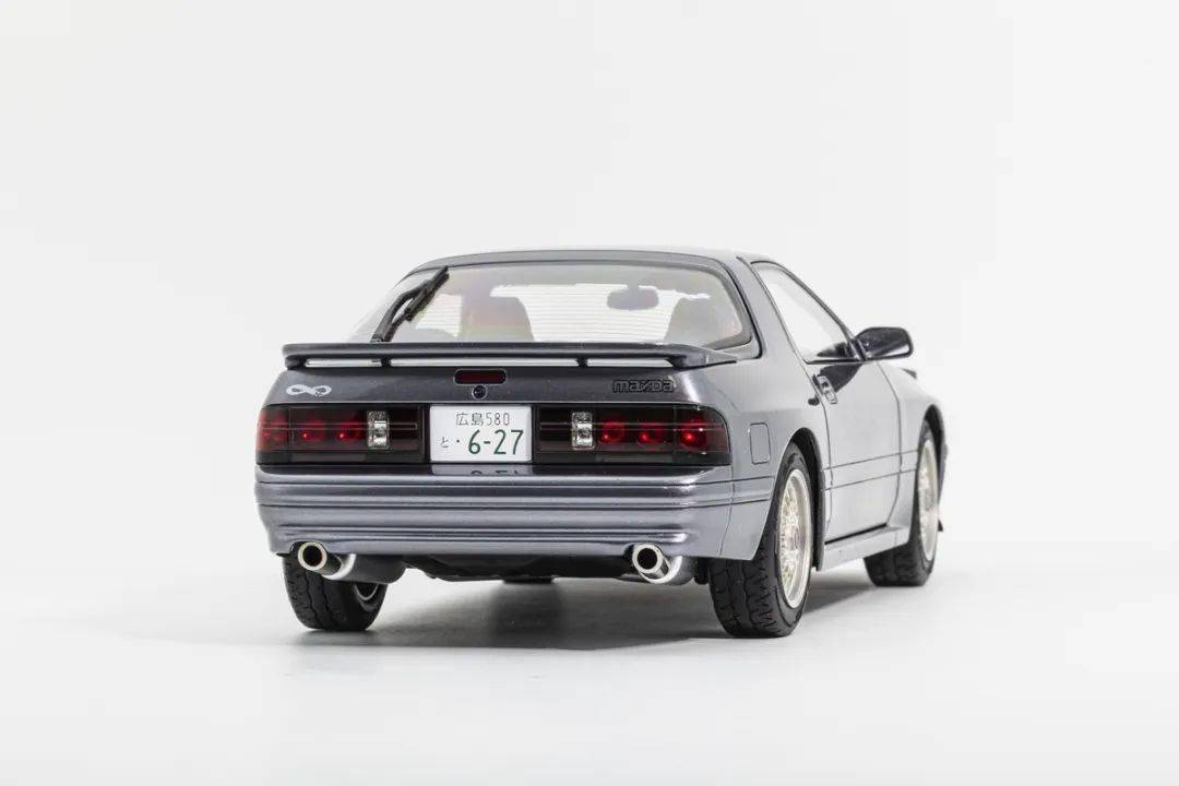 模型的車尾還原度還是比較到位的,尾燈為貫穿式,尾燈內(nèi)構(gòu)清晰,還原度高,尾燈中間為車牌;車尾的MAZDA標(biāo)和無限標(biāo)都是移印的,高位剎車燈也是獨(dú)立件的;雙邊單出的排氣管為電鍍獨(dú)立件,管口較粗,質(zhì)感也不錯,這個(gè)很JDM。