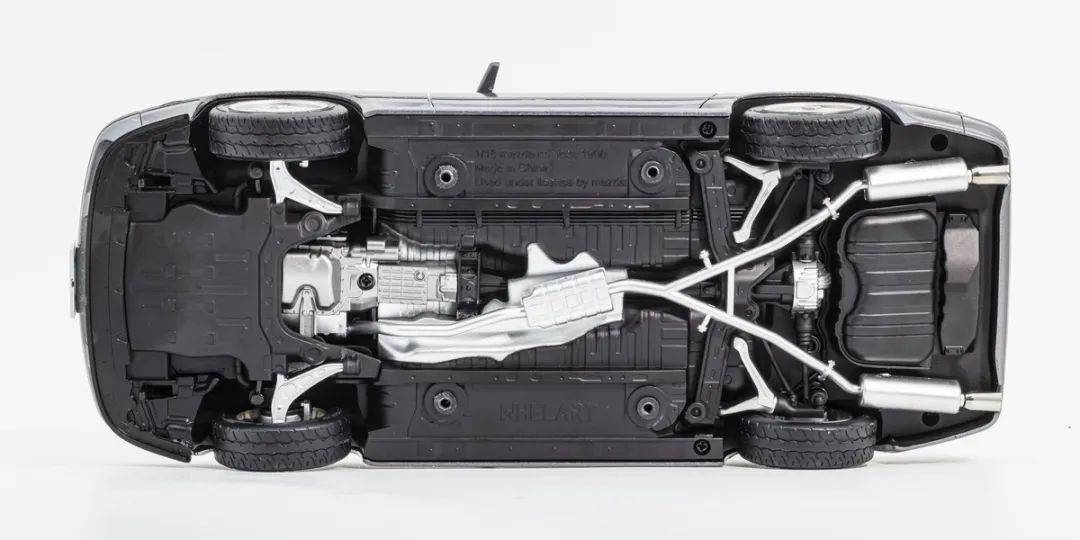 模型的底盤結(jié)構(gòu)比較復(fù)雜,懸掛系統(tǒng)、變速箱、傳動軸等刻畫得都非常精致,分色也做得很到位;不過和AA的模型一樣,很多都是樣子貨,基本不能動;排氣系統(tǒng)基本都是獨(dú)立件,質(zhì)感非常好,排氣管末端很有金屬質(zhì)感。