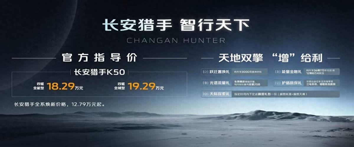 長(zhǎng)安獵手K50四驅(qū)全域型,官方指導(dǎo)價(jià)19.29萬(wàn)元;長(zhǎng)安獵手K50四驅(qū)全能型,官方指導(dǎo)價(jià)18.29萬(wàn)元。另外,長(zhǎng)安獵手同步煥新,全系產(chǎn)品12.79萬(wàn)元起。