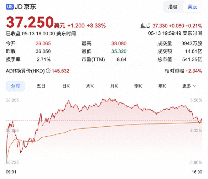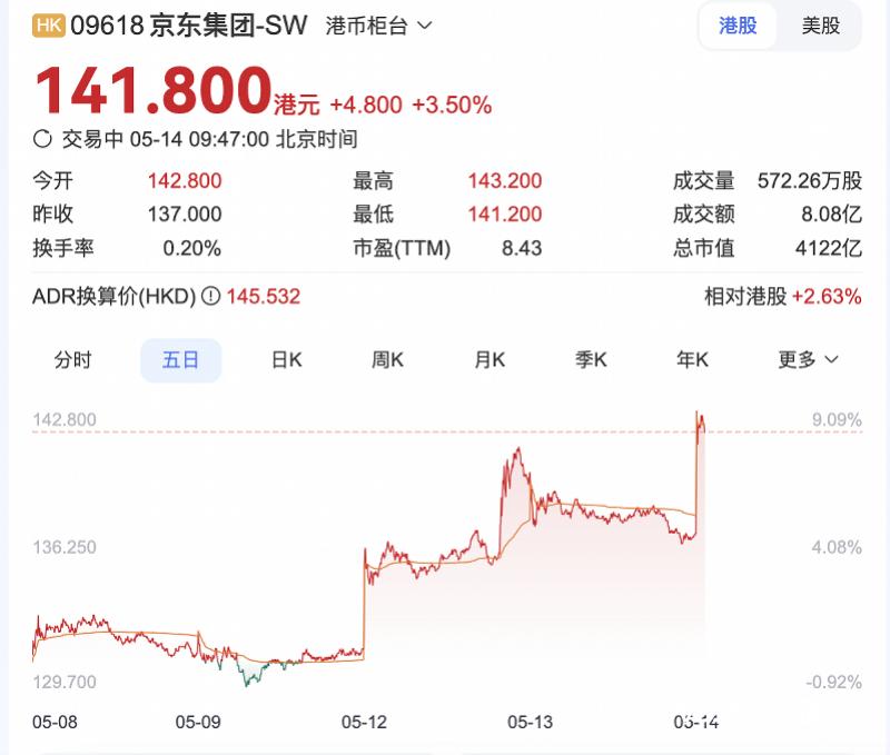 在業績帶動下,京東美股漲3.33%,收盤37.25美元;港股近日也連續上揚,今早開盤142.8港元,漲3.72%。