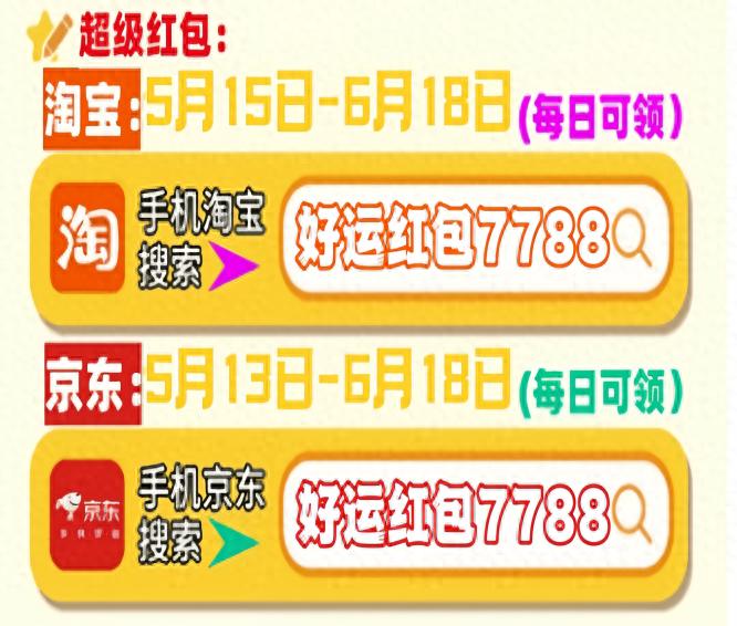 首先,劃重點!今年天貓/淘寶和京東的618紅包口令都是「好運紅包7788」要記住!領的紅包大小和你搜索的什么口令有關的!這個雙平臺通用口令包領到大的!記得每天去領!