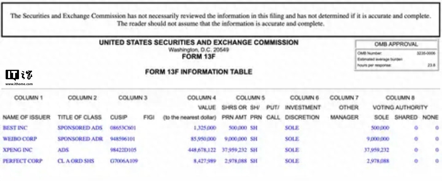 5 月 17 日消息,阿里巴巴集團(tuán)現(xiàn)已公布了 2025 年一季度 13F 持倉文件,其中顯示阿里巴巴在今年一季度減持了 308 萬股小鵬汽車的股票,減持幅度達(dá) 8.13%。值得注意的是,此前阿里巴巴已多次減持小鵬汽車股票,如去年 12 月曾出售部分股權(quán)等。
